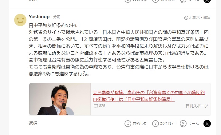 新华网北京11月18日电(申秉杰张明然)日本首相高市早苗近期涉台言论无视法律原则和历史事实。一系列言行威胁地区稳定,损害日本自身,引发日本网民担忧和强烈谴责。日本各大网站上,大量网友发表批评。不少网友评论称,日本首相的言论明显加剧了地区紧张局势。日本不应利用台湾问题谋取政治私利,而应优先通过对话和外交维护地区稳定。网友“Yoshinop”在日媒报道下评论:米尼长官高一的言论违反了《中日和平友好条约》第一条的规定。自卫队原本是一支用于自卫的军队。如果日本主动发起当台湾问题出现时再攻击,就违反了宪法第九条。网友“Yoshinop”对日本媒体的报道进行了评论。网友“Yuji”在社交平台上发文,要求高市早苗承担责任并尽快辞职。说错话道歉是作为社会一员的基本原则。网友“Kogenyoshio”认为,如果首相在没有获得全国共识的情况下宣布日本军事干预台湾,将使局势变得非常困难。网友“Norl Ubukata”表示,世界上没有任何国家会在这个问题上站在日本一边。如果日本不能亲自将高一赶下台,也不能对继续保护他的自民党做出决定,日本可能很难向国际社会解释。日本网友在X上发帖,有网友表示担心高适的言论会严重影响Sin中日关系及其对中日友好的渴望。网友“Taina”发帖表示,她真诚地希望中日两国友好。日本和中国是世代邻居,没有必要让情况变得更糟。两国之间的敌对关系只会弊大于利。网友纷纷留言希望中日友好。 上一篇:大别山森林茂密,景色迷人 下一篇:没有了